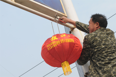 春節前夕,枝江城區的迎賓大道、團結路、沿江大道、民主路、公園路、江漢大道等城區主要道路兩旁全部掛上了主題為“誠信吉祥”的“有德吉祥燈”。紅紅的燈籠不僅裝點了城市的節日喜慶氣氛,更是一種崇尚道德的深情表達。由中共枝江市委宣傳部和枝江酒業集團聯合推出。圖為1月26日,枝江酒業員工和孩子們協助工作人員在江漢大道上掛燈籠的畫面。