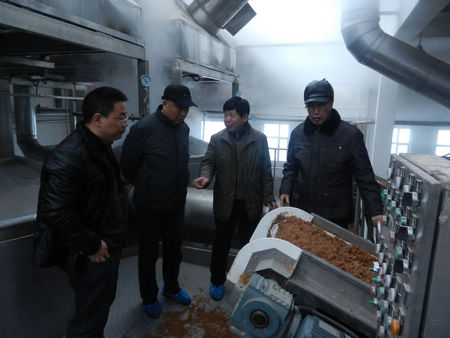 省酒業(yè)協(xié)會(huì)會(huì)長(zhǎng)趙志昌(右二)介紹自動(dòng)化釀酒設(shè)備運(yùn)行情況