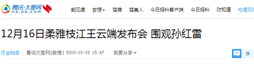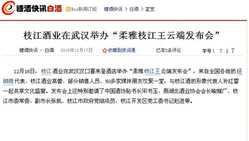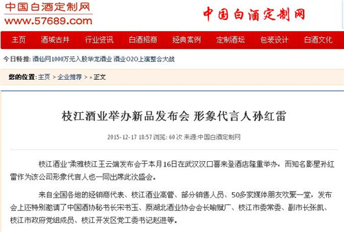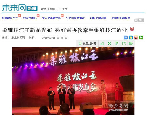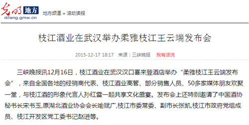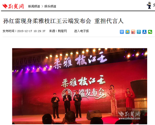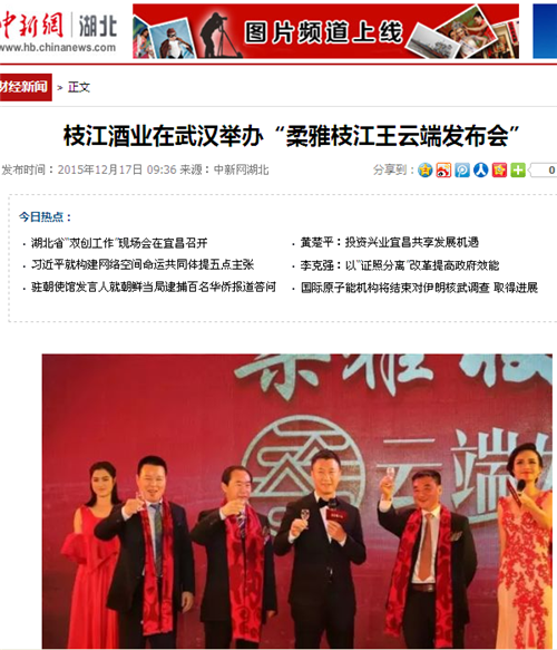 枝江酒業(yè)12月16日在武漢漢口喜來(lái)登酒店舉辦的“柔雅枝江王云端發(fā)布會(huì)”,受到了媒體界朋友的廣泛關(guān)注。兩天來(lái),有近百家媒體報(bào)道和轉(zhuǎn)載。有新華網(wǎng)湖北、中新網(wǎng)湖北、騰訊大楚網(wǎng)、光明網(wǎng)、新民網(wǎng)、新浪、搜弧、中國(guó)網(wǎng)湖北、荊楚網(wǎng)、消費(fèi)日?qǐng)?bào)網(wǎng)、釀酒科技、長(zhǎng)江網(wǎng)、漢網(wǎng)、糖酒快訊、中國(guó)酒業(yè)、中華網(wǎng)、第一農(nóng)經(jīng)等網(wǎng)絡(luò)媒體,有湖北日?qǐng)?bào)、武漢晨報(bào)、三峽日?qǐng)?bào)、三峽晚報(bào)、三峽商報(bào)、湖北畫報(bào)等報(bào)紙媒體;有枝江酒業(yè)12月16日在武漢漢口喜來(lái)登酒店舉辦的“柔雅枝江王云端發(fā)布會(huì)”,受到了媒體界朋友的廣泛關(guān)注。兩天來(lái),有近百家媒體報(bào)道和轉(zhuǎn)載。有新華網(wǎng)湖北、中新網(wǎng)湖北、騰訊大楚網(wǎng)、光明網(wǎng)、新民網(wǎng)、新浪、搜弧、中國(guó)網(wǎng)湖北、荊楚網(wǎng)、消費(fèi)日?qǐng)?bào)網(wǎng)、釀酒科技、長(zhǎng)江網(wǎng)、漢網(wǎng)、糖酒快訊、中國(guó)酒業(yè)、中華網(wǎng)、第一農(nóng)經(jīng)等網(wǎng)絡(luò)媒體,有湖北日?qǐng)?bào)、武漢晨報(bào)、三峽日?qǐng)?bào)、三峽晚報(bào)、三峽商報(bào)、湖北畫報(bào)等報(bào)紙媒體;有湖北電視臺(tái)、三峽電視臺(tái)、枝江電視臺(tái)等電視媒體;有“玩轉(zhuǎn)宜昌”、“酒說(shuō)”等眾多微信平臺(tái)。尤其是微信新媒體,傳播快,關(guān)于“柔雅枝江王云端發(fā)布會(huì)”的報(bào)道被眾多關(guān)注枝江酒業(yè)、關(guān)注柔雅枝江王新品的消費(fèi)者和孫紅雷的粉絲刷屏。湖北電視臺(tái)、三峽電視臺(tái)、枝江電視臺(tái)等電視媒體;有“玩轉(zhuǎn)宜昌”、“酒說(shuō)”等眾多微信平臺(tái)。尤其是微信新媒體,傳播快,關(guān)于“柔雅枝江王云端發(fā)布會(huì)”的報(bào)道被眾多關(guān)注枝江酒業(yè)、關(guān)注柔雅枝江王新品的消費(fèi)者和孫紅雷的粉絲刷屏。